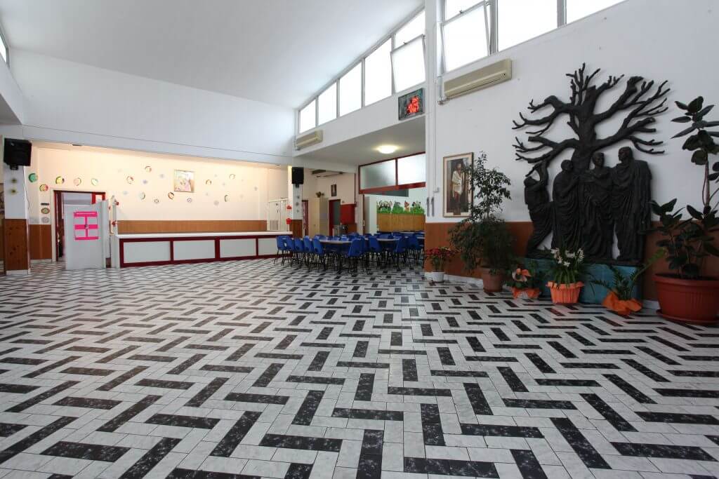 Luogo ampio e luminoso dotato di arredo nuovo: 8 tavoli da N°6 persone cadauno, 3 tavoli da 12 persone cadauno e sedie in plastica di colore azzurro. Dispone di un distributore d’acqua a due getti: refrigerata e a temperatura ambiente per essere usata durante il pranzo. E’ a disposizione di tutti gli utenti dell’Istituto. La consumazione del pranzo durante l’anno scolastico costituisce parte integrante dell’attività educativa proposta agli alunni.